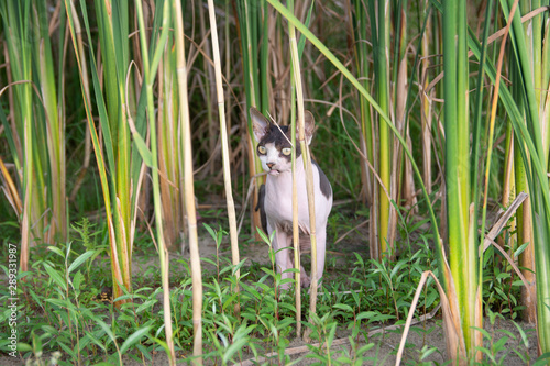 © Alexandra, Obraz premium Sphynx cat sits in the reeds in nature during a walk on a summer day.