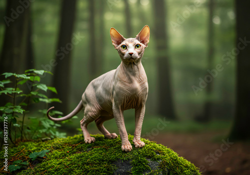 © dimas, Fototapeta premium Sphynx cat standing alert on a mossy rock in a dense forest