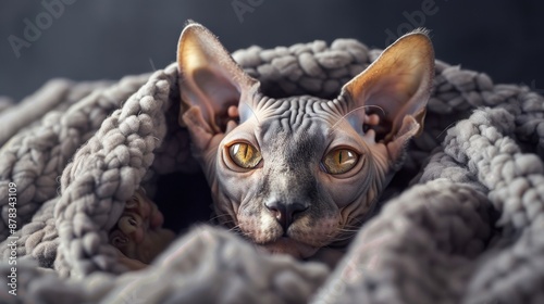 © Nathaphat, Obraz premium Sphynx Cat Wrapped in Cozy Knit Blanket, Close-Up Portrait