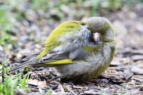 Naklejka premium Śpiący dzwoniec skulony na ziemi, mały zielony ptak odpoczywający w ogrodzie.