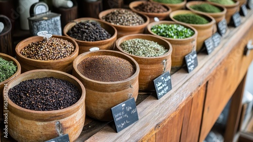 © SOPIAH, Fototapeta premium Spice and Herb Display in Wooden Bowls at Market Stall