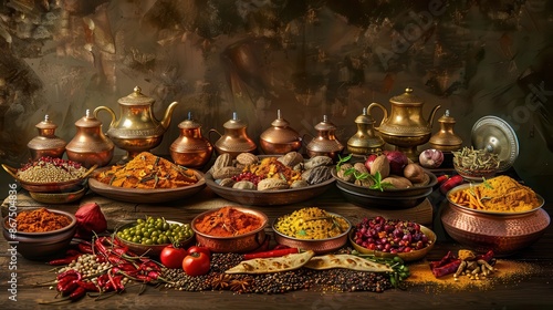 © Bijac, Fototapeta premium spice explosion vibrant array of traditional indian dishes and colorful spices culinary still life photography
