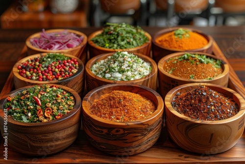 © Tuong, Fototapeta premium Spice-filled Wooden Bowl in Busy Kitchen: Aromas Infuse Culinary Masterpiece