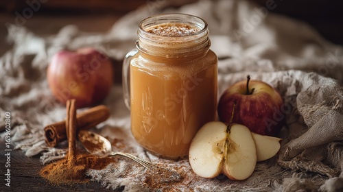 © Jane Kelly, Fototapeta premium Spiced hot apple juice in mason jar with apple slices and nutmeg sprinkles. Cozy autumn background