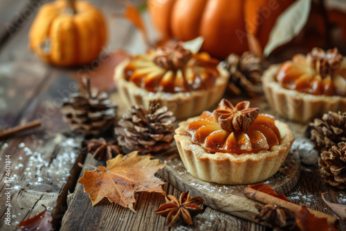 Fototapeta premium spiced pumpkin tartelettes decorated with star anise and pine cones on a...