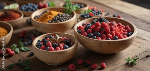 Fototapeta premium Spices and berries in wooden bowls on rustic table, harvest, spice shelf, farmhouse decor, vibrant colors, fresh ingredients