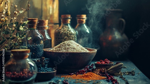 © Juan, Fototapeta premium Spices and herbs in clay containers on wooden table in traditional rustic kitchen environment