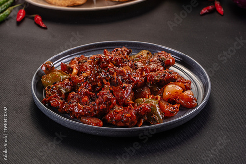 Fototapeta premium Spicy Indian chili dish with peppers and onions served on a gray plate