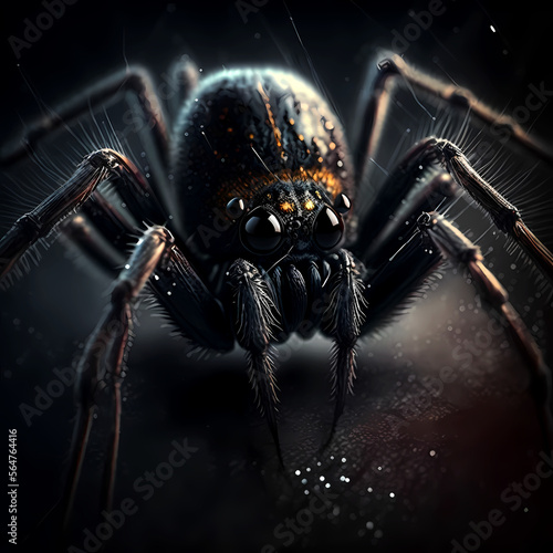 Fototapeta premium Spider. Black super creative spider on a cobweb. Dark background, art, illustration. Poster, print. Generative AI.