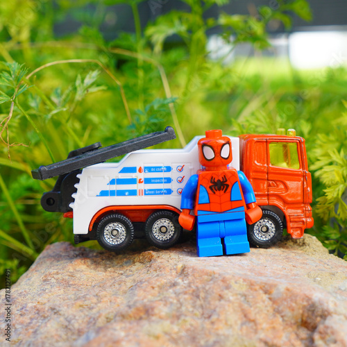 © Everyday Frame, Obraz premium Spider-Man toy figure stands beside a tow truck on a rock outdoors