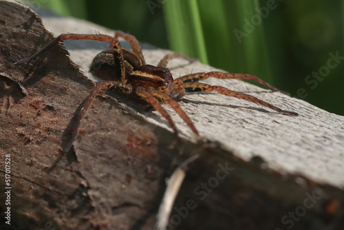 Obraz premium spider on the web, Raft spider in macro on a wooden bar