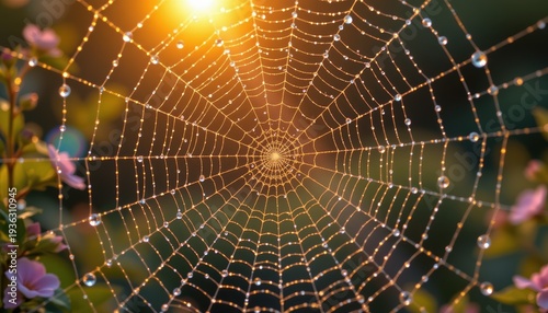 Obraz premium Spider web covered in morning dew with sunlight and purple flowers in background