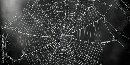 Naklejka premium Spider web, intricate details, morning dew, droplets, symmetrical pattern, delicate threads, black and white, macro photography, natural geometry, glistening, ethereal, atmospheric, moody, foggy backg