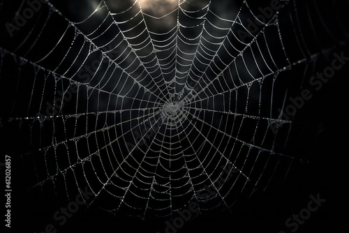 Fototapeta premium Spider web on black darkness, halloween background, AI