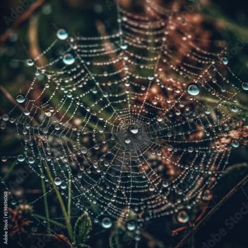 © Jasper, Naklejka premium spider web with dew drops by Generative AI