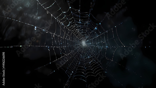 © Arief, Naklejka premium Spider Web with Dew Drops on Black Background – Artistic Macro Illustration
