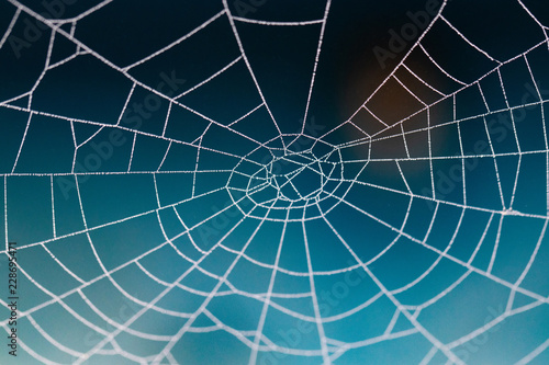 © Oleksandr, Obraz premium Spider web with raindrops on blurred background; close-up