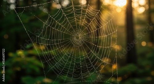 © nad, Naklejka premium Spiderweb adorned with shimmering water droplets, a testament to nature's artistry with sunlight