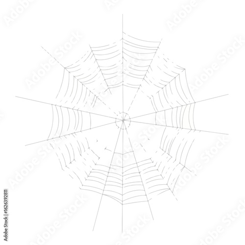 © Vincenzo, Obraz premium Spiderweb against white background is intricately woven, its delicate threads creating unique pattern. Spiderweb design showcases radial symmetry and connecting lines.