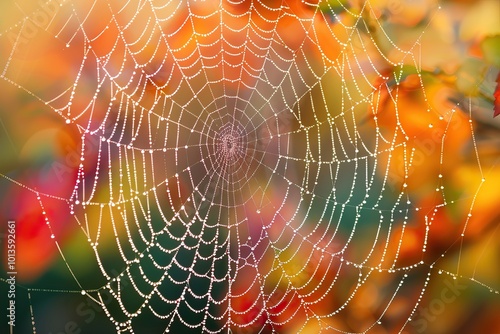 © Volha, Naklejka premium Spiderweb covered in dew drops, glowing in soft, multicolor background