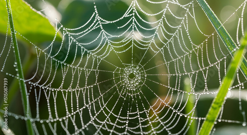 © David, Naklejka premium Spiderweb Covered With Dewdrops During a Spring Morning On a Green Meadow