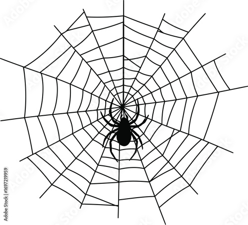 © Abdullah, Obraz premium Spiderweb silhouette with hanging spider centered in solid black on white background