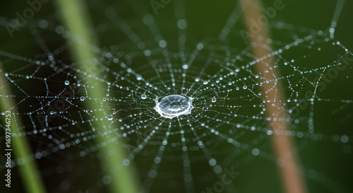 © Spzy, Naklejka premium Spiderweb with water droplets glistens, radiating from the center on a blurred green backdrop