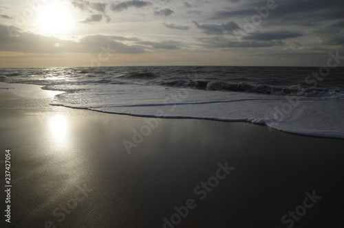 Fototapeta premium Spiegelnder Nordseestrand bei Sonnenuntergang