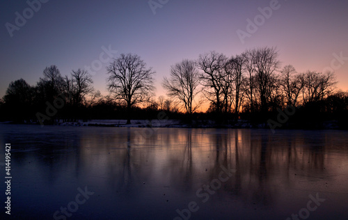 © Fotolla, Obraz premium Spiegelung von Bäumen in einem gefrorenen See im Abendrot