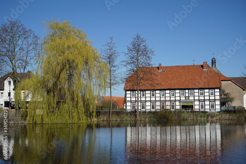 © sturmschaden, Fototapeta premium Spiegelung von Häusern im Wasser an einem Teich in einem Ort
