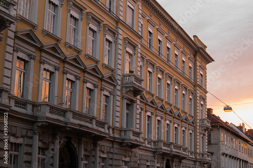 © selinamichelle, Fototapeta premium Spiegelungen in Fenstern von älteren Gebäuden bei Sonnenuntergang