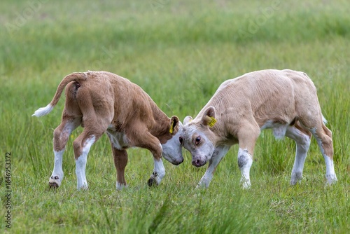 © silkehuettche, Fototapeta premium Spielende Kälber