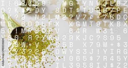 Naklejka premium Spilling gold popper confetti and glitter on white table, showing bows, ribbon, stars, text overlay