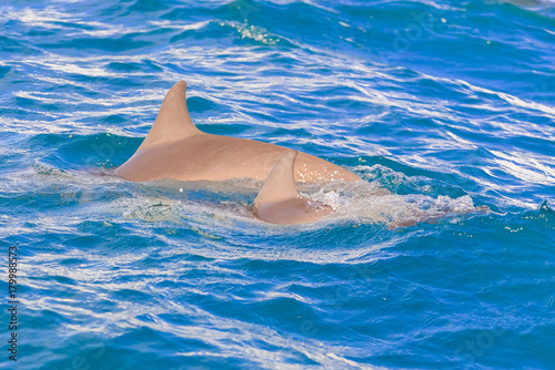 Naklejka premium Spinner dolphin with baby dolphin swimming in Pacific ocean