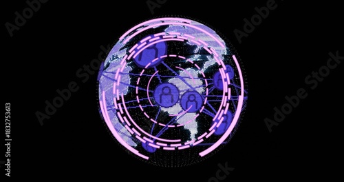 Obraz premium Spinning dotted globe floating against black void, showing magenta rings, node icons and links