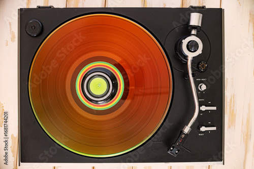 Obraz premium Spinning record, needle arm in natural light. Top view of hi-fi turntable,