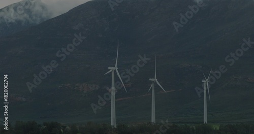 Obraz premium Spinning white wind turbines standing at mountain base, with treeline, rocky slopes, mist