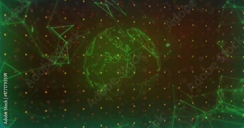 Fototapeta premium Spinning wireframe Earth globe in cyberspace grid with floating yellow pixels and green connections