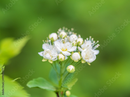 © Dmitrii Potashkin, Fototapeta premium Spiraea chamaedryfolia or germander meadowsweet or elm-leaved spirea white flowers with green background.