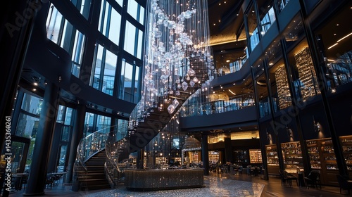 © Pannee, Obraz premium Spiral chandelier captured from below showcasing symmetry and sparkle