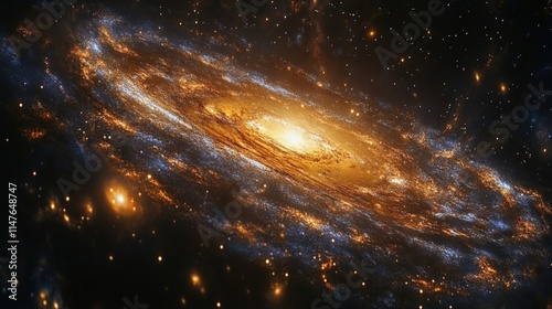 Naklejka premium Spiral galaxy, gold and blue hues, cosmic dust.