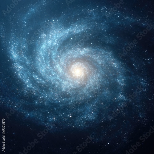 © bethari, Obraz premium Spiral galaxy rendering, swirling blue and white celestial body in vast cosmos.