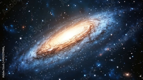 © Khoirul, Fototapeta premium Spiral galaxy swirling in dark space, illuminated core, distant stars.