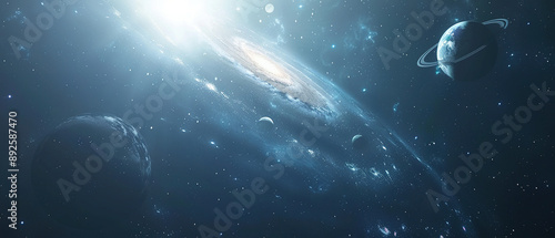 Fototapeta premium Spiral galaxy with planets and stars in deep space. Solar system with nebulae and galaxy. Science and education background. Stars and galaxies. Galaxy spiral background. Solar system planets