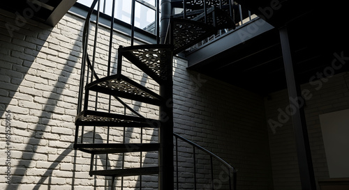 Fototapeta premium Spiral staircase with brick wall background and sunlight creating shadows in an interior scene