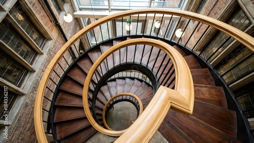 © Qory, Fototapeta premium Spiral Wooden Staircase with Elegant Design.