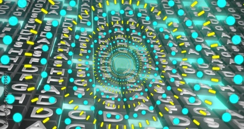 Fototapeta premium Spiraling tunnel drawing into digital space, showing cyan nodes and yellow dashes on lettered tiles