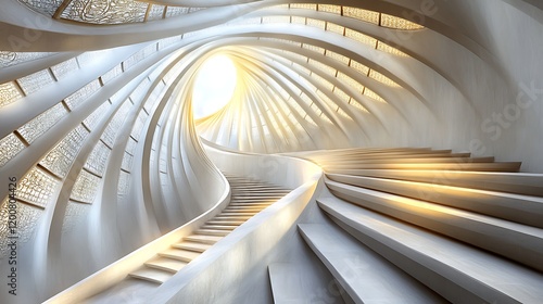 © Murai, Fototapeta premium Spiraling White Staircase Ascending Towards Light