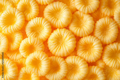 © Artem, Fototapeta premium Spirally arranged cheese puffs with soft texture on a bright background for a colorful display