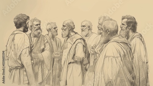 © T Studio, Naklejka premium Spirit and Fellowship: Acts 2 Biblical Illustration with Holy Spirit, Early Church Growth on Beige Background and Copyspace